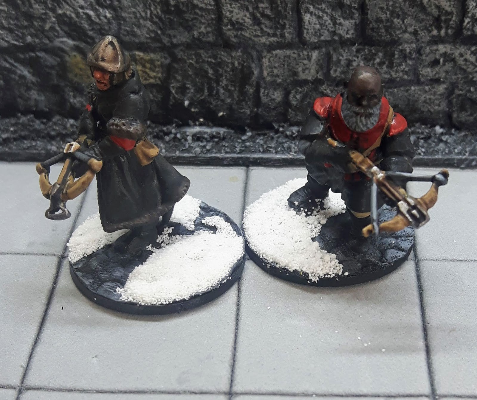 Once the base colours were on, I re-highlighted the red and the faces with the original colour, then went up one shade on the red, adding a very faint highlight of Evil Sunz Scarlet. Lastly, I painted the bases and added some Army Painter snow flock to give them that Frostgrave look.